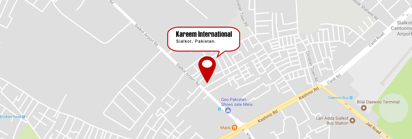 Home Home/Contact Us Kareem InternationalAirport Road Kotli Behram,Sialkot-51310,Pakistan Contact Person: Mr. Sajeel Ur RehmanEmail: info@kareemintl.comEmail: infointernational3@gmail.comUrl: www.kareemintl.comMobile: +92 331 2967676Mobile: +92 303 4896633